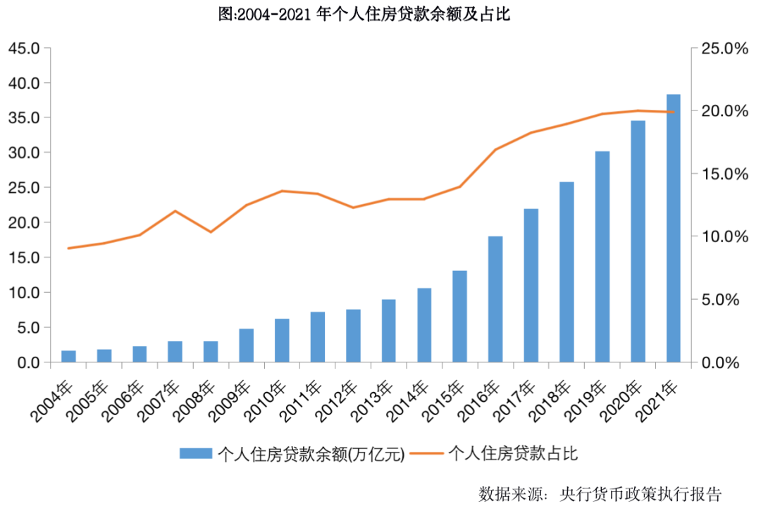 第三,居民過度加杠桿購(gòu)房。2015年以來(lái),基于各線城市房?jī)r(jià)輪動(dòng)上漲的正向激勵(lì)效應(yīng),很大程度上刺激居民超前購(gòu)房消費(fèi),表現(xiàn)于居民不斷加杠桿購(gòu)房,杠桿率持續(xù)攀升,市場(chǎng)購(gòu)買力難免透支。據(jù)央行貨幣政策執(zhí)行報(bào)告顯示,截至2021年末,個(gè)人住房貸款余額38.3萬(wàn)億元,占各項(xiàng)貸款余額的比重達(dá)到19.9%。