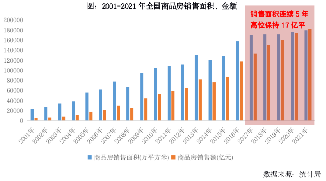 第五,住房需求趨于飽和,商品房銷售面積連續(xù)5年高位保持17億平方米。2017-2021年,全國(guó)商品房銷售面積連續(xù)5年高位保持在17億平方米。2021年,全國(guó)商品房銷售面積17.9億平方米,同比僅增長(zhǎng)1.9%。與此同時(shí),全國(guó)城鎮(zhèn)居民人均居住面積達(dá)到40平方米以上,真實(shí)反映行業(yè)規(guī)模基本見頂,未來(lái)成交規(guī)模或?qū)⒉饺胂陆低ǖ馈?/p>
