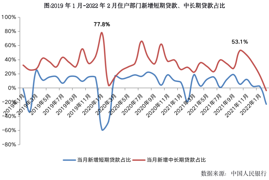 不過,居民實(shí)際按揭貸款顯著不及市場(chǎng)預(yù)期。2021年10月,住戶部門中長(zhǎng)期貸款占比一度升至53.1%的高位,但隨后歷月占比持續(xù)走低。2022年2月,住戶部門短期貸款減少2911億元,中長(zhǎng)期貸款減少459億元,住戶中長(zhǎng)期貸款歷史首次出現(xiàn)負(fù)增長(zhǎng)。