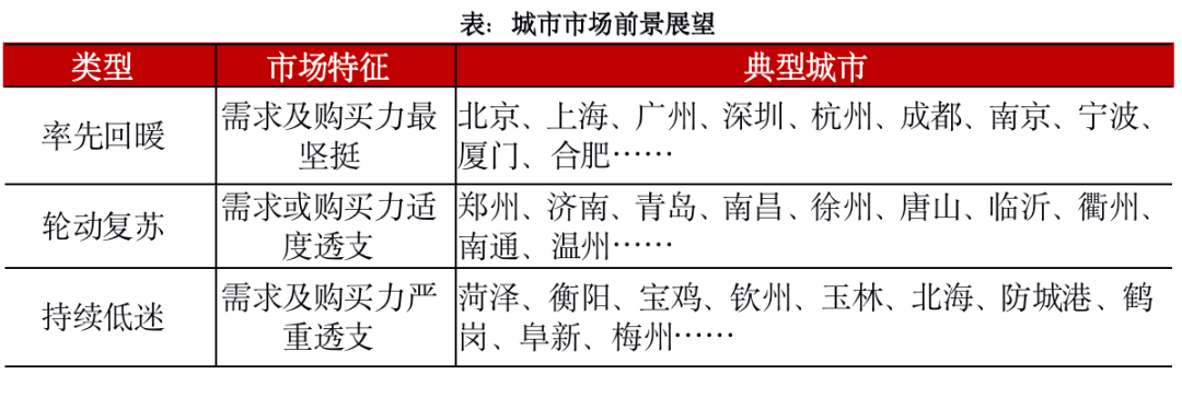 因此,我們認(rèn)為隨著市場(chǎng)信心逐步恢復(fù),北京、上海、杭州等核心一二線城市市場(chǎng)有望率先轉(zhuǎn)暖,鄭州、濟(jì)南、徐州等弱二線及強(qiáng)三線城市市場(chǎng)或?qū)⑤唲?dòng)復(fù)蘇。基于市場(chǎng)需求及購(gòu)買力嚴(yán)重透支,菏澤、北海、寶雞等弱三四線城市市場(chǎng)或?qū)⒊掷m(xù)低迷。