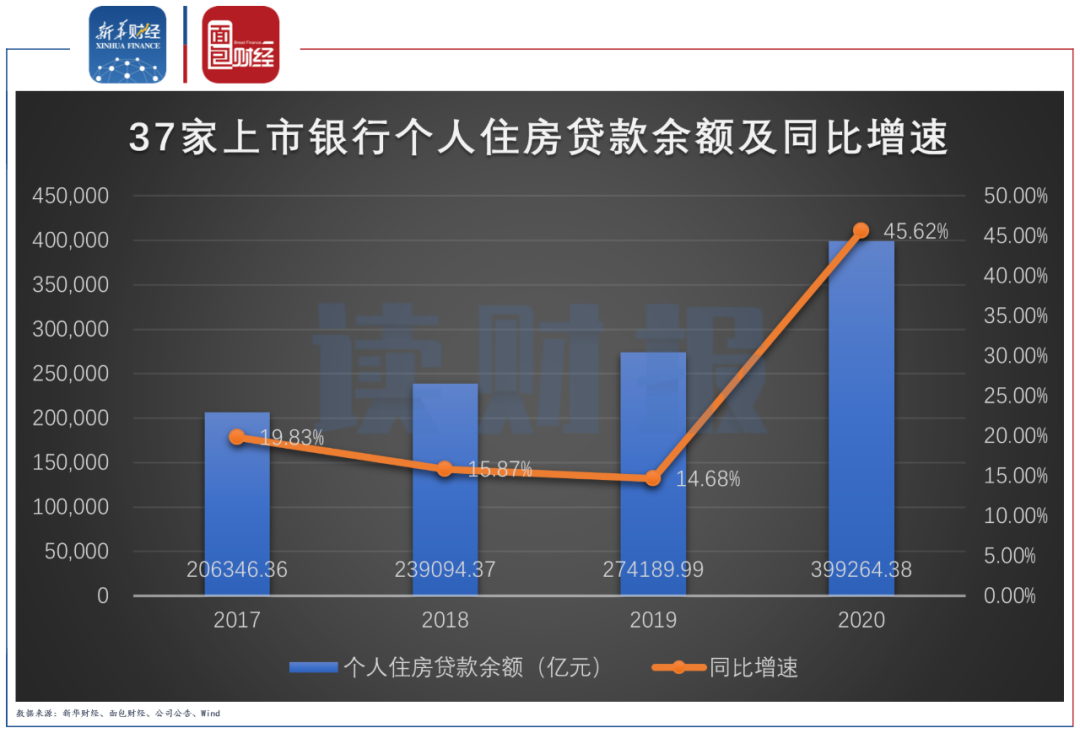 個人住房貸款方面,由于紫金銀行未詳細披露,除去該行以外,2020年37家上市銀行個人住房貸款余額達39.93萬億元,較上年末增加1.25萬億元,增幅達45.62%。
