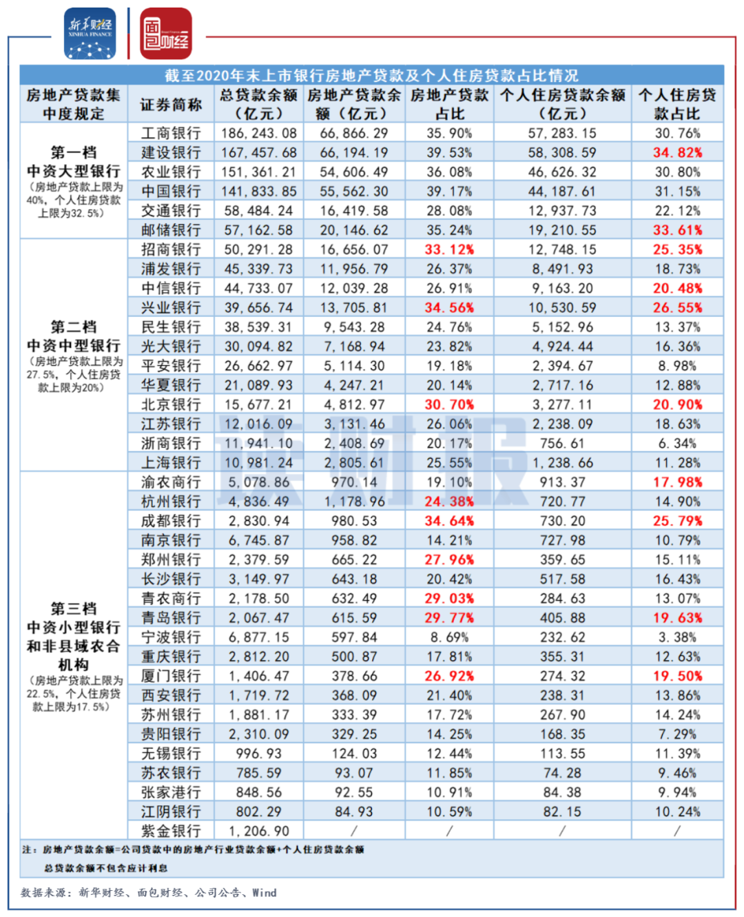 相關規定顯示,中資大型銀行(第一檔)、中資中型銀行(第二檔)、中資小型銀行和非縣域農合機構(第三檔)的房地產貸款占比上限分別為40%、27.5%和22.5%;個人住房貸款占比上限分別為32.5%、20%和17.5%。其中,中資大型銀行中的上市銀行為國有六大行;中資中型銀行中的上市銀行為股份制銀行以及北京銀行、上海銀行、江蘇銀行。中資小型銀行和非縣域農合機構中的上市銀行為不包括第二檔中的上市城商行及農商行。