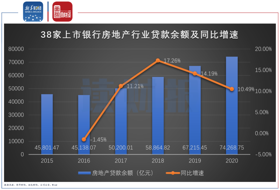 截至2020年末,38家上市銀行公司貸款中房地產行業貸款余額達7.43萬億元,較2019年末增加7053.3億元,增幅為10.49%。