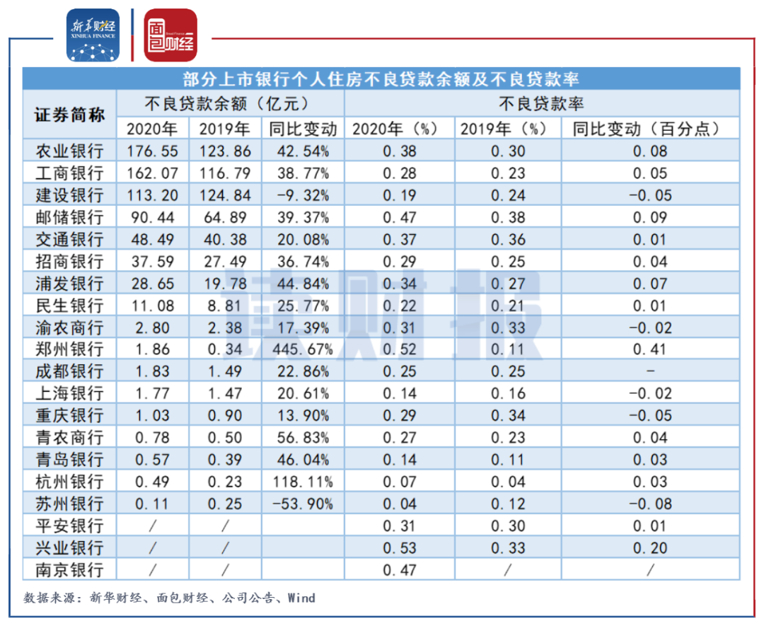 數據顯示,截至2020年末,個人住房不良貸款余額較多的仍是農行,為176.55億元,其次是工行和建行,分別為162.07億元和113.2億元。城商行和農商行的個人住房不良貸款余額整體偏少。與上年末相比,蘇州銀行和建行的不良貸余額出現下降,同比分別下降53.90%和9.32%。而鄭州銀行由于2019年基數較小,增幅超過4倍。