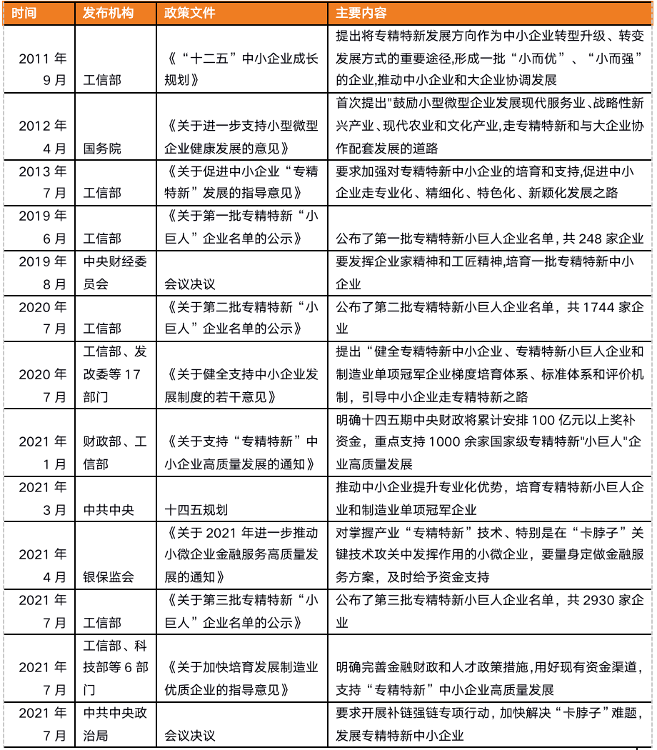在2021年1月,財政部、工信部發(fā)布《關(guān)于支持“專精特新”中小企業(yè)高質(zhì)量發(fā)展的通知》提出給與100億獎補資金支持,之后,培育專精特新“小巨人”被納入“十四五”規(guī)劃之中,銀保監(jiān)會為“專精特新”中小企業(yè)量身定制金融解決方案,工信部等6部委發(fā)文支持引導(dǎo)中小企業(yè)走“專精特新”之路,以及中共中央政治局會議強調(diào)發(fā)展“專精特新”中小企業(yè),至少在6個中央級重要政策、會議決議中提及“專精特新”。至此,國家政策給予的支持上升到了前所未有的高度。