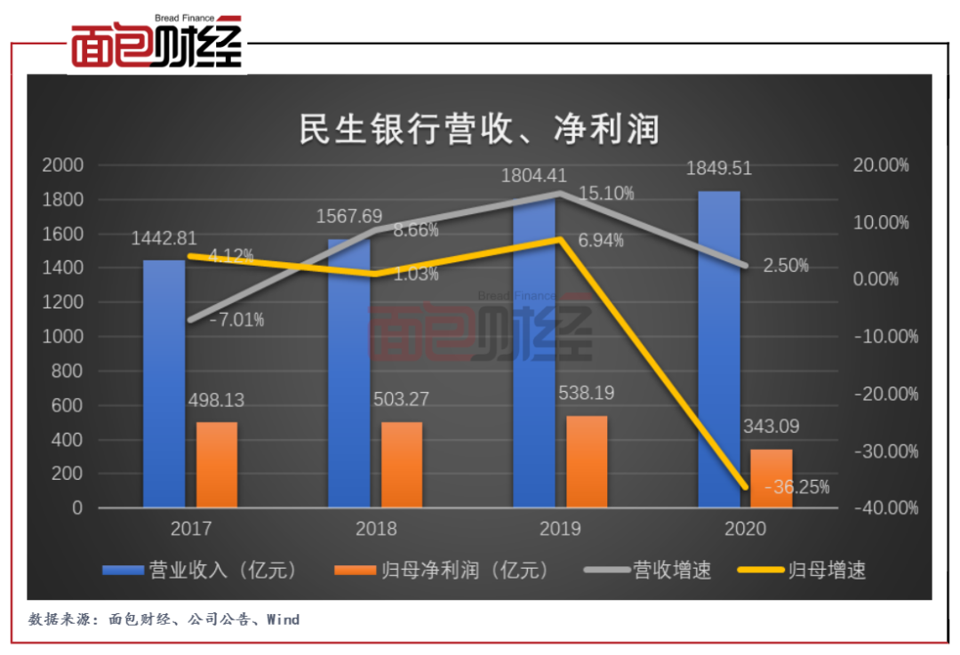 從業績來看,2020年民生銀行實現營業收入1849.51億元,同比上升2.5%;由于2020年該行計提大量信用減值損失,導致其歸母凈利潤銳減195.1億元。