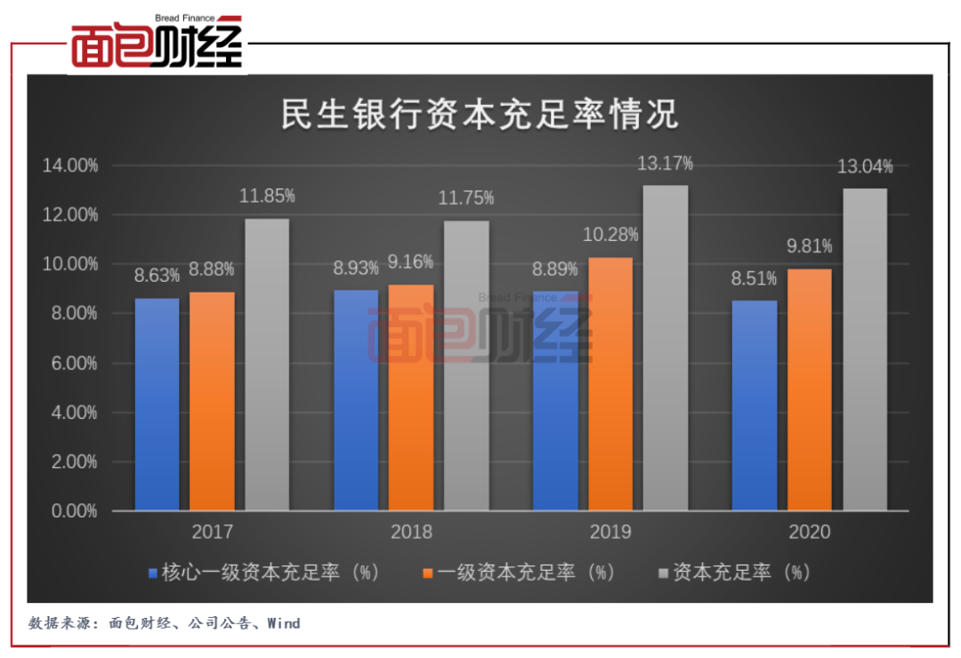 數據顯示,截至2020年末,民生銀行的資本充足率為13.04%,較上年末下降0.13個百分點;核心一級資本充足率、一級資本充足率分別為8.51%、9.81%,較上年末下降0.38、0.47個百分點。