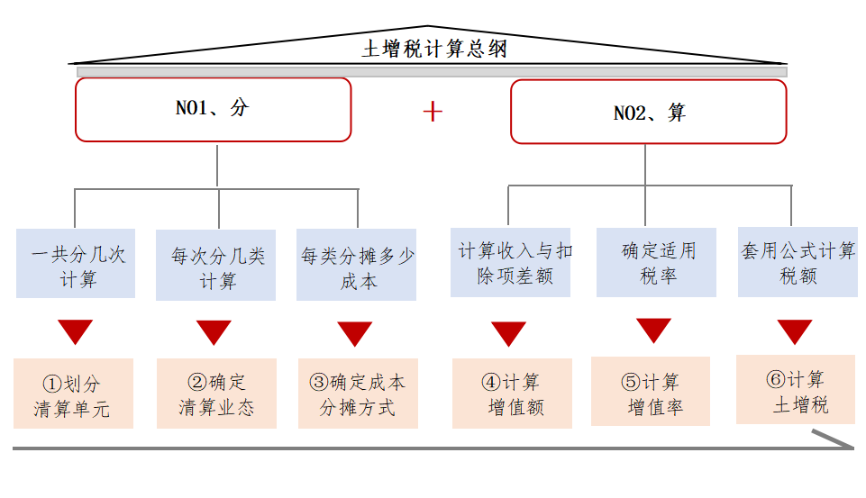 大家都知道,土增稅計(jì)算過(guò)程,可以分解為——“分”和“算”兩個(gè)步驟,即:分單元、分業(yè)態(tài)、分?jǐn)偝杀尽H缓笤賹?duì)應(yīng)計(jì)算收入、成本、增值率…如下圖示: