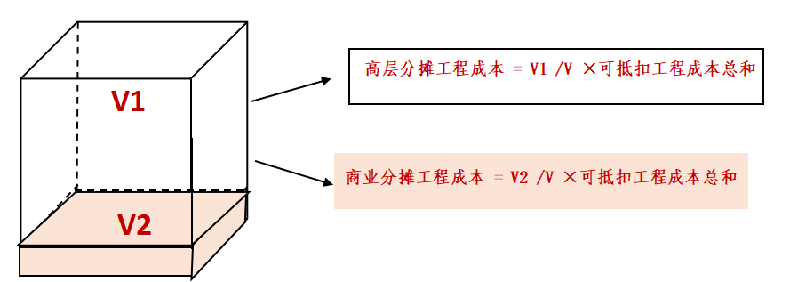 即轉(zhuǎn)讓的建筑面積占可轉(zhuǎn)讓總建筑面積的比例進(jìn)行分?jǐn)偂_@里的建筑面積實(shí)際上指的是可售建面,一般只指的是地上可售建面,不包含地下車(chē)庫(kù)。通常對(duì)于工程成本采用的分?jǐn)偡绞綖榻ㄖ娣e分?jǐn)偂H缦聢D示意:V為項(xiàng)目地上總可售建面,高層及商業(yè)建面分別為V1和V2。