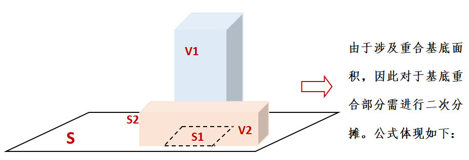 與占地面積、建筑面積分?jǐn)傔壿嬒嗨疲窗凑辙D(zhuǎn)讓部分的對(duì)應(yīng)的投影基底面積占可轉(zhuǎn)讓總基底面積的比例進(jìn)行分?jǐn)偂V档米⒁獾氖牵瑢?duì)于涉及基底面積重合的業(yè)態(tài),在公用一個(gè)基底面積的情況下,往往根據(jù)基底面積進(jìn)行一次分?jǐn)偤螅俑鶕?jù)重合基底的兩個(gè)業(yè)態(tài)的建筑面積進(jìn)行二次分?jǐn)偂H缦聢D所示,高層及其下底商公用部分基底面積S1,底商未與住宅相接的基底面積為S2;設(shè)高層可售建面V1,底商可售建面V2,項(xiàng)目總基底面積S