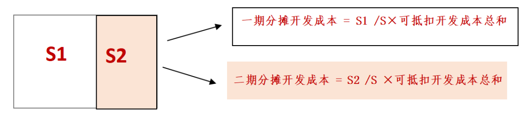 即轉(zhuǎn)讓土地使用權(quán)的面積占可轉(zhuǎn)讓土地使用權(quán)總面積的比例進(jìn)行分?jǐn)偅粚?duì)于分期開(kāi)發(fā)的項(xiàng)目,通常按照占地面積進(jìn)行分?jǐn)偅簿褪怯谜嫉孛娣e法來(lái)分?jǐn)偯恳粋€(gè)清算單元下的土地成本和工程成本。如下圖示意:S為項(xiàng)目總占地面積,分兩期開(kāi)發(fā)S1和S2。