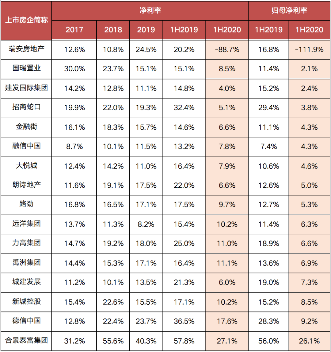 不少房企利潤率從行業高位速降,招商蛇口、建發國際、金融街、國瑞置業等無論是凈利率還是歸母凈利率都表現的較為弱勢。