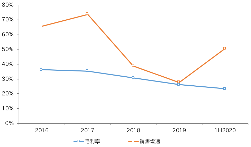 如禹洲集團,2016-2019年復合增長率達47.9%,但毛利率卻從36.3%持續降低至26.2%,今年上半年進一步降至23.4%,低于行業中位數水平,歸母凈利率也只有6.9%。