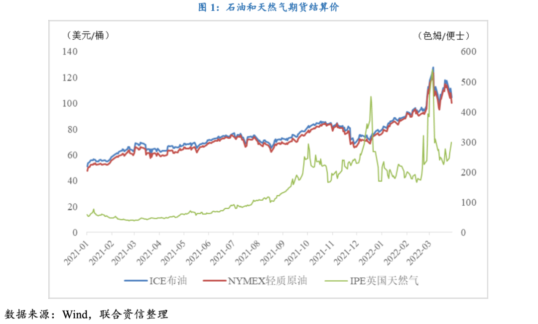 俄烏戰(zhàn)爭爆發(fā)后,美國和英國相繼宣布對俄羅斯采取石油、液化天然氣和煤炭出口禁運舉措,能源禁運導致全球能源供給缺口進一步走擴。ICE布油大幅沖高并一度逼近140美元/桶關口,NYMEX原油期貨也一度漲破130美元/桶關口,雙雙創(chuàng)下自2008年8月以來的新高;IPE英國天然氣期貨收盤價一度突破500便士/色姆,持續(xù)刷新歷史新高。雖然俄烏談判取得了一定進展,石油價格有所回落,但俄羅斯宣布歐洲國家購買天然氣需用俄羅斯盧比結算,同時里海石油管線(CPC)暫停運營,市場對能源斷供的擔憂再度推漲能源價格,ICE布油價格再度回升至120美元/桶,天然氣價格也出現(xiàn)顯著回升。因此,在地緣政治風險依舊持續(xù)的背景下,預計短期內原油和天然氣價格依舊會保持上漲趨勢,全年平均價格有望達到100美元/桶以上。