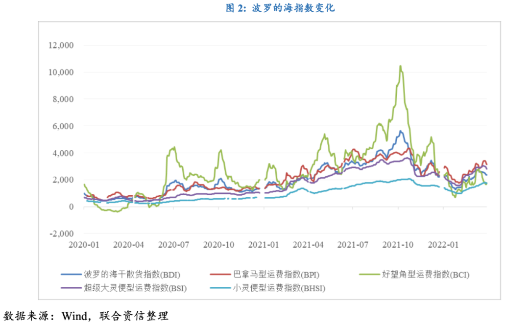 海運方面,烏克蘭政府宣布自2月24日起關閉所有港口和碼頭,其中包括位于最大港口敖德薩港;3月2日,英國對俄羅斯制裁措施進一步升級,下令禁止俄羅斯船只進入英國港口。戰(zhàn)爭因素進一步加劇了航運風險,2月24日,美國嘉吉公司貨船在敖德薩港口附近遭遇襲擊,成為烏克蘭海域發(fā)生的首起商船遇襲事件,隨后多艘途徑黑海的貨運商船遭到襲擊,表明戰(zhàn)爭風險已經波及海運行業(yè)。港口停運和戰(zhàn)爭風險上升導致馬士基、MSC、地中海等多家航運公司暫停了在俄羅斯和烏克蘭地區(qū)的業(yè)務。市場不確定性疊加燃油價格上漲,推升運價成本持續(xù)走高,波羅的海指數(shù)所有船型運費指數(shù)自2022年年初以來均呈現(xiàn)波動上升趨勢,波羅的海散干貨指數(shù)(BDI)一度突破至2,700點。黑海地區(qū)的航線是全球重要的糧食、鋼鐵、能源產品的運輸通道,航運受阻和運費上漲導致商品供應受限,進一步加劇全球供應鏈風險。