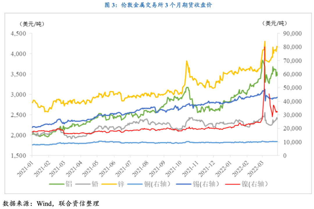 市場對有色金屬供應短缺的擔憂帶動多種有色金屬價格大幅飆升,其中倫敦金屬交易所(LME)3個月鋁期貨年內高點較年初漲幅突破35%,鋅和錫價格漲幅也達到20%,雖然目前價格較盤中高位有所回落,但受供給端不確定性影響仍保持上漲趨勢。此外,由于俄鎳無法交割,金屬鎳一度上演逼空行情,3月7日—8日,3個月鎳期貨收盤價單日漲幅分別達到59.1%和72.7%,盤中一度突破10萬美元/噸關口,持續(xù)刷新歷史新高。占據(jù)了全球市場約50%份額的烏克蘭兩大氖氣供應商Ingas和Cryoin因戰(zhàn)爭因素均已停止運營,對稀有氣體供應中斷的擔憂情緒加速稀有氣體價格上漲,中國國內氖氣主流價格上漲至15,000元/立方米,較年初價格上漲近14倍。