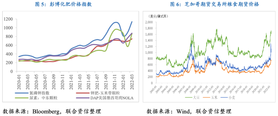 俄烏沖突導致化肥價格快速走高,生產成本上漲疊加出口禁令影響,全球糧食價格速度走高并推升下游食品價格;玉米和大豆是飼料生產的主要原料,糧食價格上漲還將通過飼料價格上漲向下游養(yǎng)殖業(yè)傳導