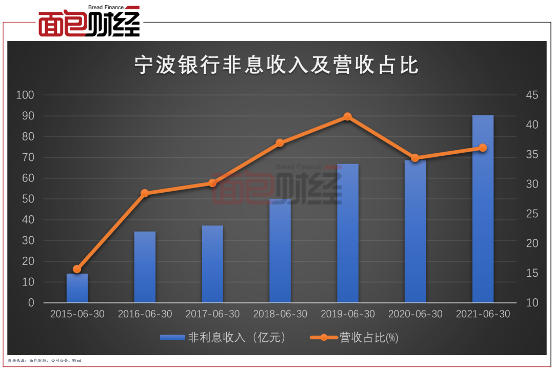 2021上半年,該行實現(xiàn)非利息收入90.36億元,較上年同期增加21.66億元,增幅為31.53%。其在營收中的占比也由2015年中期的15.65%提升至2021年中期的36.12%。