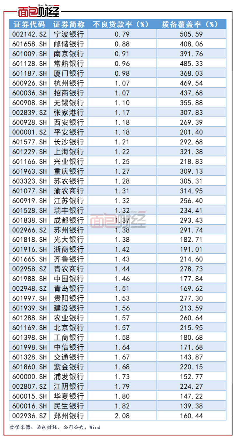 與其他上市銀行相比,寧波銀行的資產(chǎn)質(zhì)量優(yōu)勢較為明顯。由于多數(shù)銀行暫未發(fā)布中報業(yè)績,以2020年年末數(shù)據(jù)來看,寧波銀行的不良貸款率最低,而撥備覆蓋率則處于上市銀行之首。