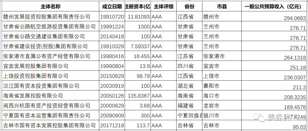 6、AAA城投公司所在區域的的一般預算收入情況。扣除掉直轄市和副省級城市,蘇州市是AAA城投公司一般預算收入數據最高的地級市;吉林市是AAA城投公司一般預算收入數據最低的地級市。目前共有12家城投公司所在區域的一般預算收入低于300億元。
