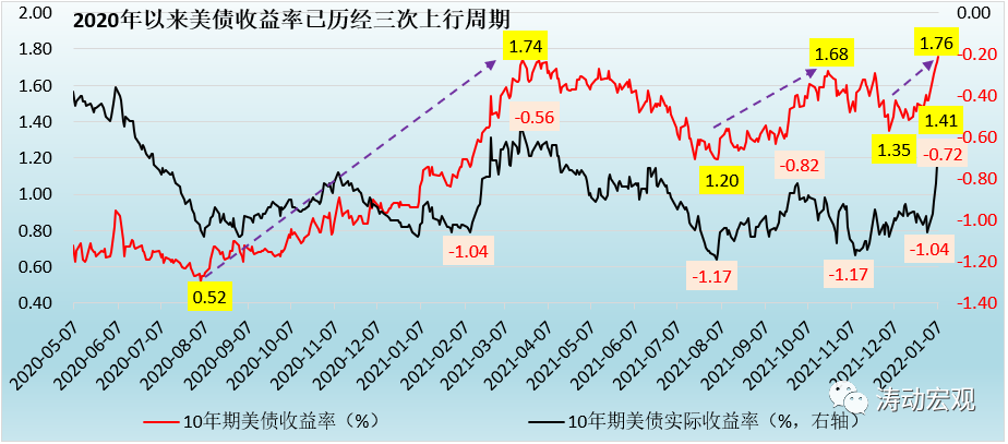 2021年12月,特別是美聯儲2021年年終議息會議以來,美債收益率上行節奏明顯加快,幅度也更大。而與之前不同的是,本輪上行周期中,利率水平的上升幅度明顯大于前兩輪、節奏也較前兩輪更快。其中,美債實際收益率上行力度似乎更強。具體看,2021年12月以來,10年期美債名義收益率由1.41%的水平上升至目前的1.76%(上升幅度為35BP),10年期美債實際收益率則由-1.04%的水平上升至目前的-0.72%(上升幅度合計為76BP)。