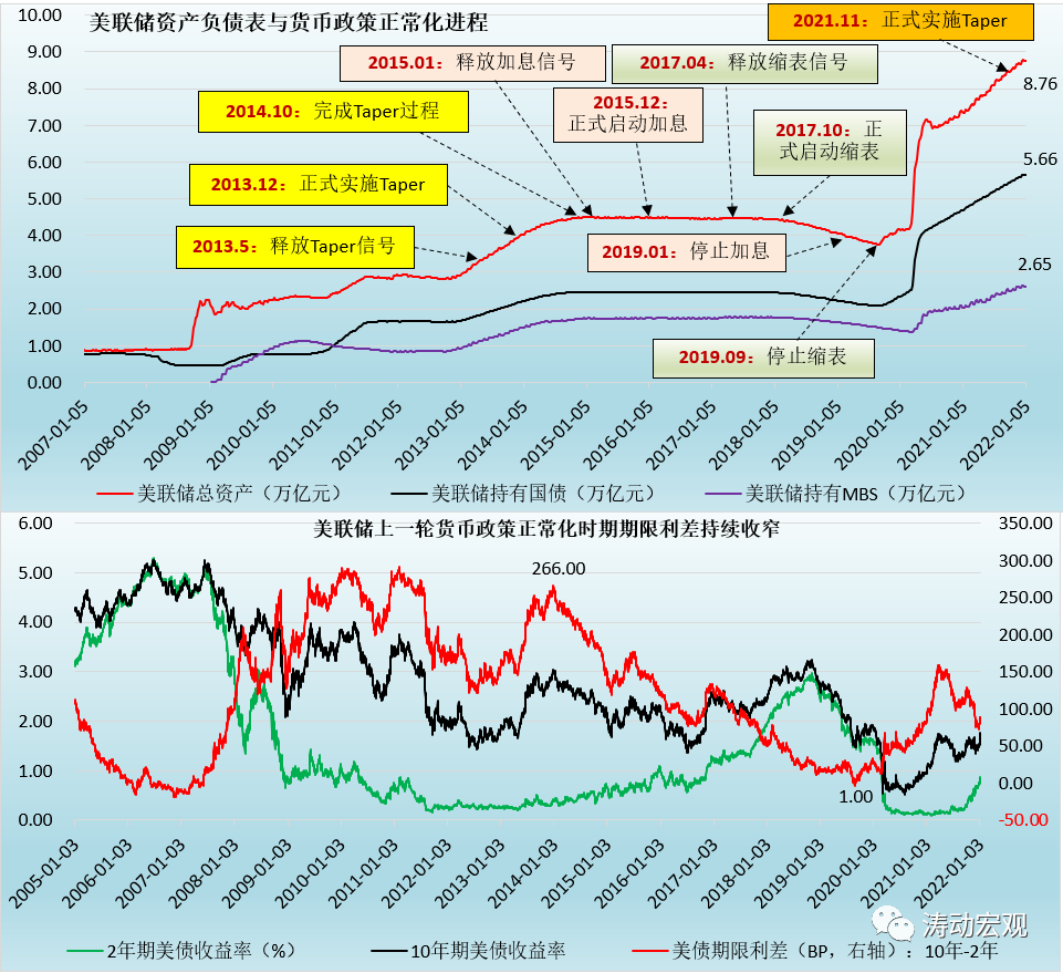 前面已經指出,美聯儲的貨幣政策正常化路徑基本上遵循“向市場釋放Taper信號——Taper過程——向市場釋放加息信號——加息——向市場釋放縮表信號——正式縮表”的邏輯脈絡。