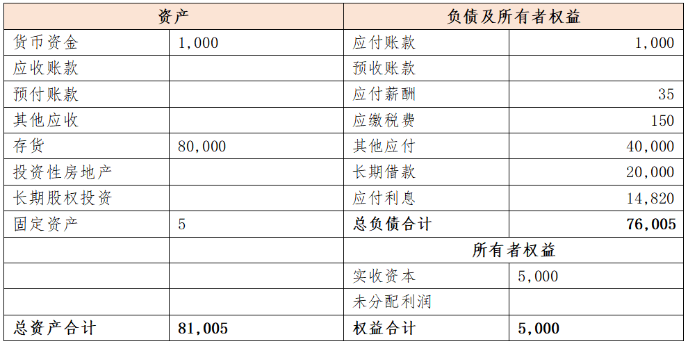 案例背景:某項(xiàng)目公司下有100畝住宅用地,開發(fā)商拿地后未開發(fā),欲轉(zhuǎn)讓項(xiàng)目公司100%股權(quán),土地轉(zhuǎn)讓報(bào)價(jià)為1000萬/畝,對(duì)方提供項(xiàng)目公司最近一次資產(chǎn)負(fù)債表如下表所示: