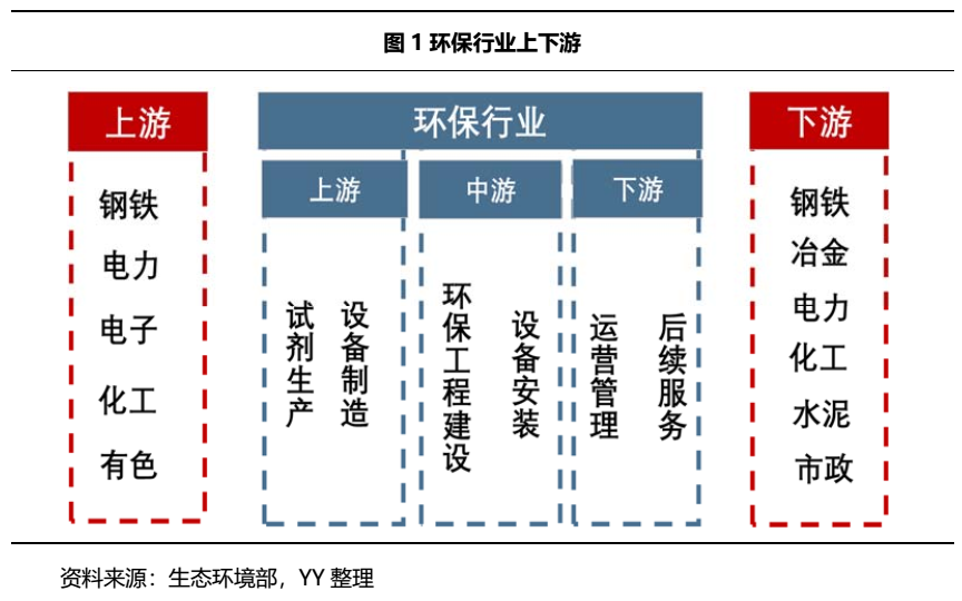 環保行業的上下游產業鏈有一定的重疊,需求方同時也是供給方,如鋼鐵、電力、化工等行業,另外,由于環保行業有很強的公益屬性,其需求變化在很大程度上取決于產業政策,因此,政府部門是環保行業重要的需求方。