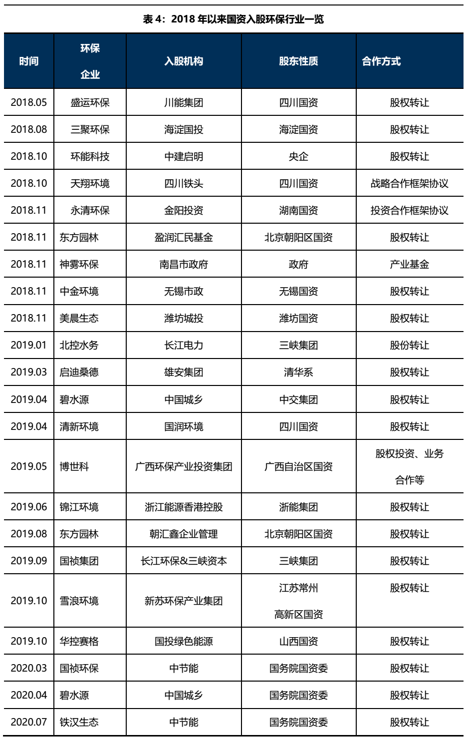 第三為民企紓困需要,例如2018年由于資管新規出臺,融資環境收縮,民企遇到資金瓶頸,國資主要充當“救援”角色。隨著國資頻頻出手,環保行業也轉向了由國企主導的市場格局。