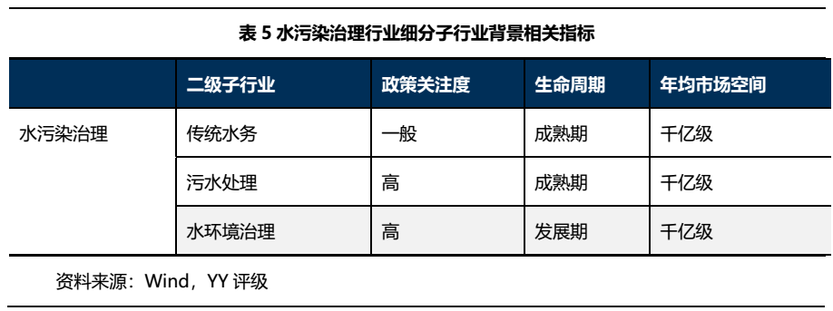 水污染治理行業為環保行業的一個子行業,水污染治理行業工程類項目占較高,進入壁壘較高,公共事業屬性較強、區域性比較明顯。另外,水污染治理行業政策力度也在不斷加碼,近年來國資頻頻入主,PPP等重資產模式的流行也加大水污染治理行業的債務壓力,導致現金流水平較弱。細分領域方面,污水處理、自來水普及市場建設已趨于飽和,未來重點集中在村鎮污水、黑臭水體治理和河道的治理上。