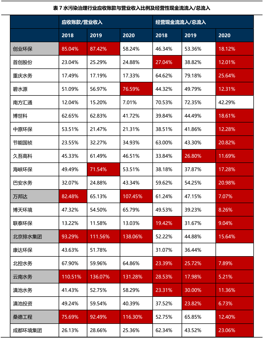 現金流方面,由于水污染治理行業的項目投資金額大,回款周期長,導致應收賬款規模和債務規模較大,現金流表現不佳,真實獲現能力存疑,現金流方面主要關注經營活動現金流入所占比重、應收賬款與營業收入的比例。