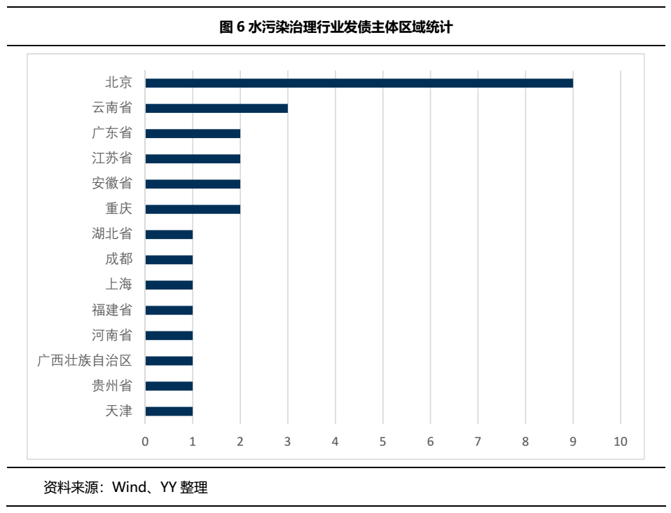 從區位來看,水污染治理行業的發債主體主要集中在北京(32.14%),其次是云南省(10.71%),重慶、安徽、江蘇和廣東緊接其后,分別占比7.14%。從主體性質看,國有企業最多20家(71.43%),其中地方國有企業16家,另外民營企業6家(21.43%)。28家水污染治理公司中共19家為上市公司,整體看水污染治理行業行業資源整合能力較強