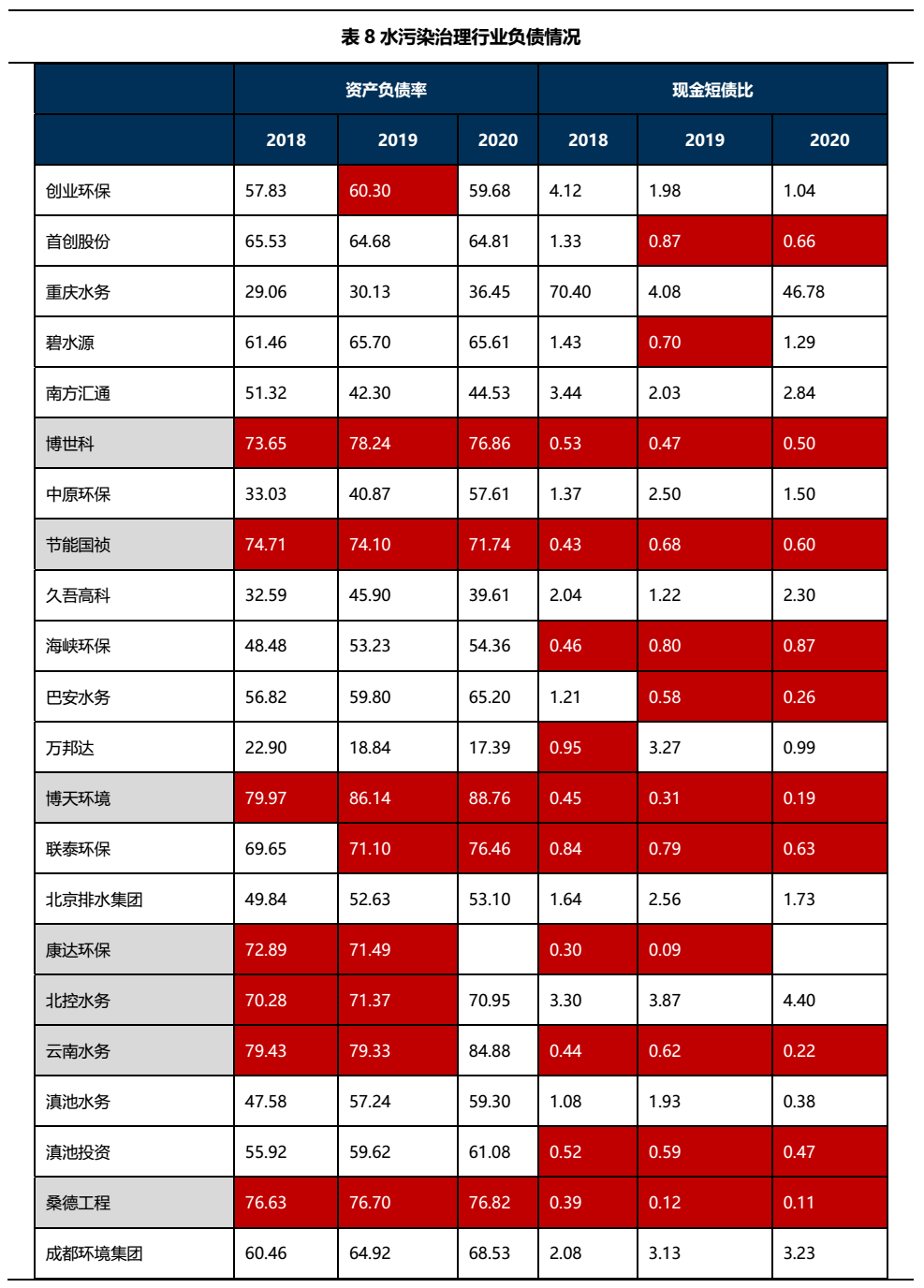 2018年至2020年水污染處理行業負債壓力持續加大,有息債務規模和債務總規模持續上升,近3年債務總規模分別為3996.31億元、4768.17億元和5354.66億元,資產負債率中位數分別為59.36%、64.68%、65.15%,現金短債比中位數分別為1.08、0.80、0.79,短期償債壓力較大。另外需注意對外擔保規模過大造成的或有風險或者債務藏匿情況。