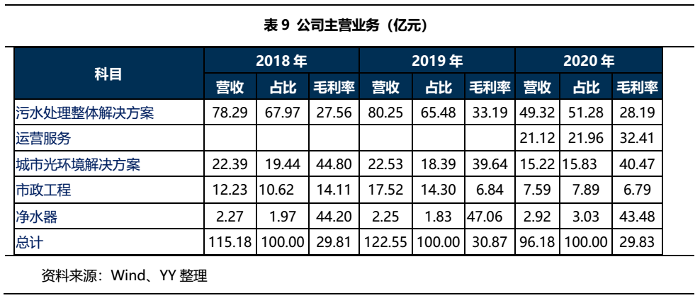 公司主營城市光環境解決方案,運營服務、市政工程和凈水器業務,結構較為豐富,主要收入來源為污水處理整體解決方案,但收入占比逐年下降。