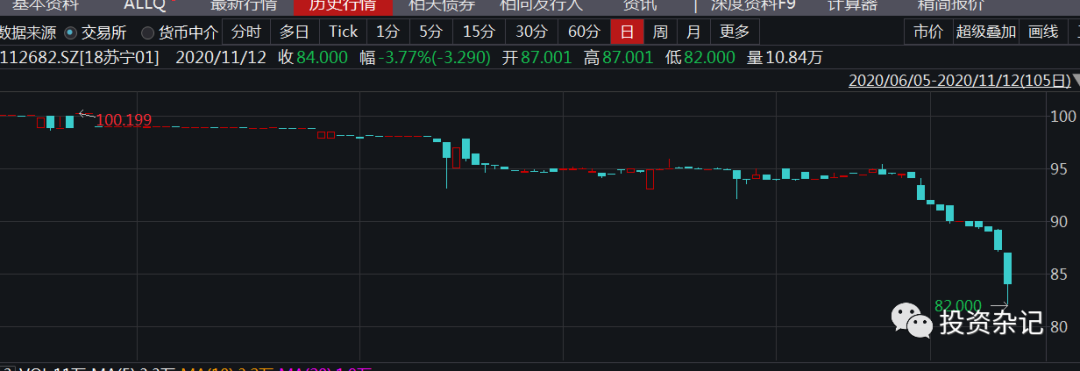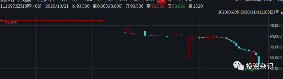 其他幾只債券價格走勢都差不多,就不一個一個貼了。蘇寧買東西打折有可能是虛的,但是自家債券打起折扣來一點不含糊啊。