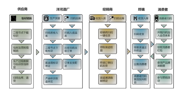 五糧液的數字化,核心是營銷數字化。目前的重點,是構建以消費者為中心的數字化運營體系。而營銷數字化首先解決的,是經銷商的亂價、竄貨、假貨問題,因而推出了“箱碼一盒碼一蓋內碼”三碼合一的方式,將信息溯源、精準營銷和貨流跟蹤結合在一起。從幾家頭部酒企的數字化進展來看,目前大多側重于渠道管理、特定供應鏈模塊和終端營銷。這其中,洋河股份的數字化探索有本質上的不同。對于白酒行業來說,數字化的重點和難點,在于如何有效地打通渠道和終端消費者,形成覆蓋上中下游鏈條的數據生態閉環。總體來看,洋河的數字化建設包括渠道在線化、用戶數據化和業務信息化三大方向。著眼的是,從客戶體驗到供應鏈全場景、全鏈路的數字一體化系統。數字化時代下,數據是核心資產。更精準地獲取有廣度和深度的數據,并能基于數據集合輔助決策,才是核心要義。這個環節也是當下酒企數字化普遍重視的環節。但問題在于,如何更好地激勵流通商和用戶,以提高掃碼率?渠道方面,洋河最為突出的是“F2B2b2C”、一物一碼的瓶箱關聯體系+終端小程序數字化運營模式。所謂“F2B2b2C”,是打通廠家(F)、經銷商(B)、門店(b),再到終端消費者(C)的數據鏈路,從而使產品溯源管理得到加強,產品進銷存和渠道物流價格信息的透明度,也得到了提高。