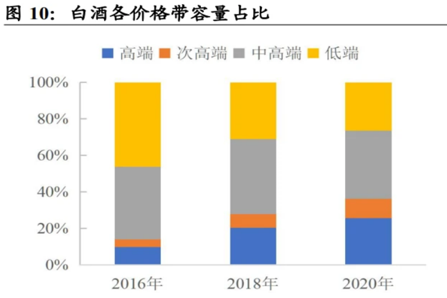而在本輪行業復蘇周期中,除了高端酒拉動行情,次高端白酒也表現搶眼。據東北證券研究顯示,次高端白酒的市場規模在2016年—2020年的四年間,從250億上升至662億,增長幅度為165%,超過高端白酒150%的增幅。市場占有率也從4.13%增長至10.66%。
