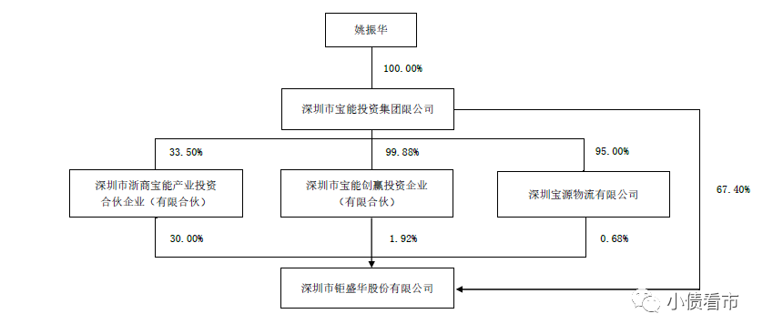 從股權(quán)結(jié)構(gòu)看,鉅盛華的控股股東為寶能投資集團(tuán),持股比例為67.4%,公司實際控制人為姚振華。