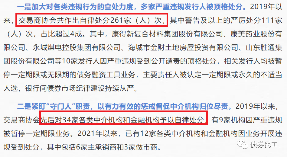 2021年9月22日,交易商協會通過官方公眾號刊發了《聚焦銀行間債券市場提質增效 嚴肅查處懲戒各類違規行為》的文章,介紹2019年以來交易商協會累計對發行人共作出自律處分261家(人)次,對34家各類中介機構和金融機構予以自律處分。從已經披露的自律處分案例來看,發行人、主承銷商、會計師事務所、評級機構、做市商等各類參與機構和相關機構的從業人員均屬于自律監管的范疇,均有被處罰的案例。所以可以看出,交易商協會的自律監管是全流程、全范圍的,每一個參與者都需要嚴格按照相關規則開展業務活動。