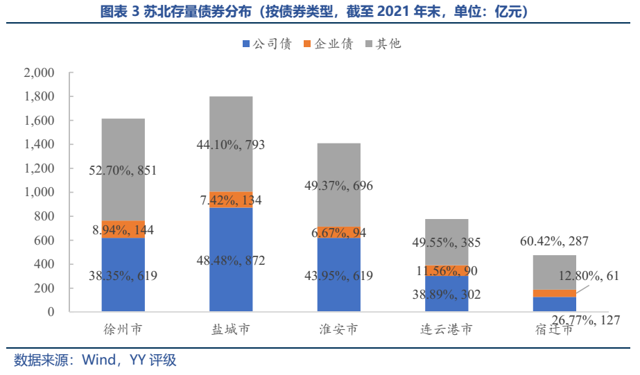 從債券結構來看,公司債、企業債和協會產品的占比分別為41.81%、8.60%和49.58%。注意到,鹽城的公司債占比最高(48.48%),結合前段時間交易所控城投債比例的輿情來看,潛在的再融資壓力整體偏高。