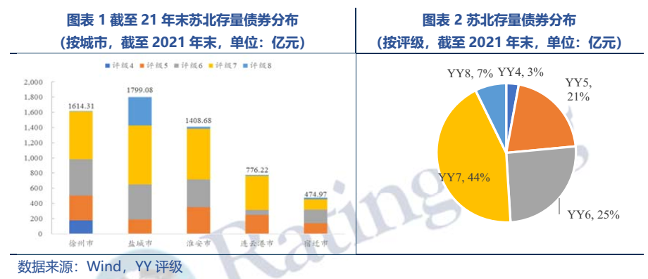 從存量債券來看,截至21年末區域城投債余額合計6,073.25億元(作為參考,同期末湖南7,656億元)。細分來看,鹽城市債券余額最多(1,799.08億元),綜合實力最強的徐州次之,淮安相較于其體量而言規模偏大(YY Ratio 1,451.96%,全省最高),宿遷余額最小(473.97億元)。另外注意到鹽城市2022年債券到期壓力較大(年內到期占比超40%)。