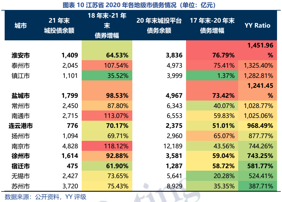 雖然目前區域再融資環境仍較好,19-21年城投債凈融資分別為443億元、930億元和1,339億元。且城投不應割裂開來看,如果從江蘇全省一盤棋的角度出發,蘇大強信仰的支撐強,屬于靠自身、靠省里,仍有積極的空間,安全距離較大。