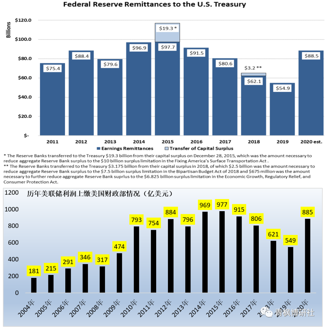 實際上,中央銀行將扣除運營費用、利息支出等之后的利潤上繳財政,是目前主要經濟體的通行做法,《美聯儲法案》、《日本銀行法》、《英格蘭銀行法》對此都有相應規定。數據上看,2020年美聯儲向美國財政部上交了885億美元的 盈利,較2019年的549億美元大幅增長61.20%。