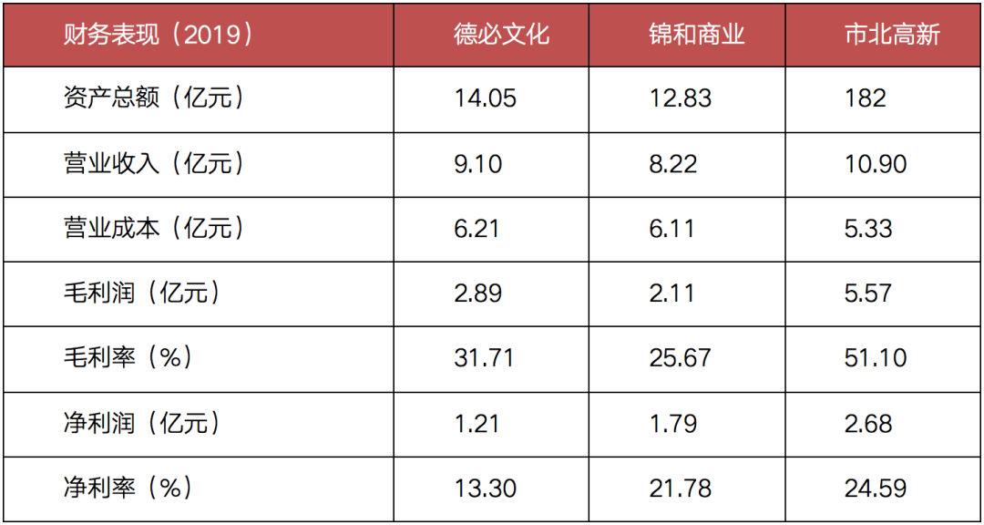 備注:德必、錦和在總資產(chǎn)與市北高新相差10倍的前提下,營業(yè)收入相差無幾。