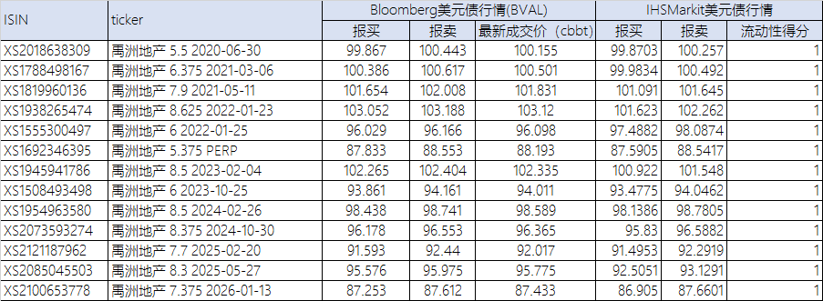 禹洲的Bloomberg美元債行情以及IHSMarkit美元債對(duì)照行情,如下表所示:
