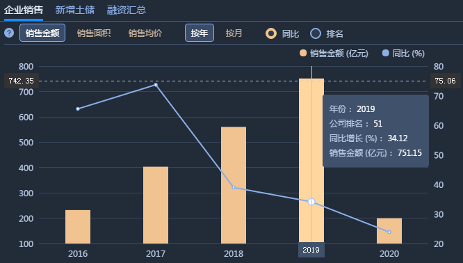 2019年全口徑合同銷售金額751.2億元,同比增長34.1%,還未邁進(jìn)千億門檻;