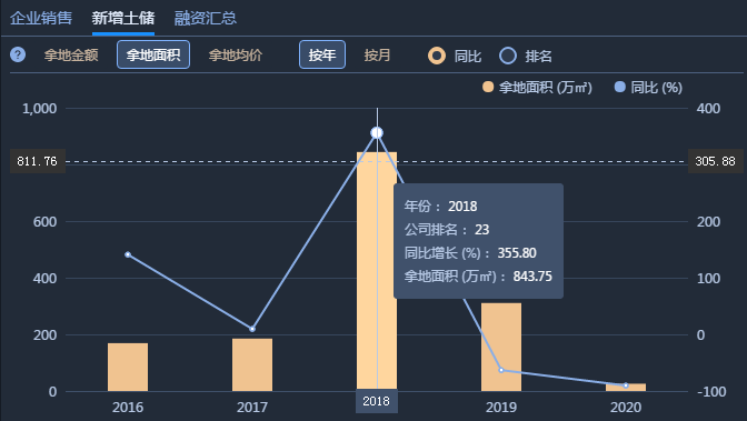2018年,禹洲地產(chǎn)并新增了土地儲(chǔ)備843.75萬平方米,同比增長355.80%。但是在2018年禹洲全年銷售額560.03億元,并沒有達(dá)成全年600億元的目標(biāo)。