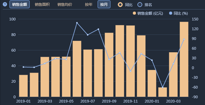 從月度銷售數(shù)據(jù)看,由于疫情原因,今年2月份是禹洲的銷售低谷,4月份直竄至96.27億元,同比增長87.41%。