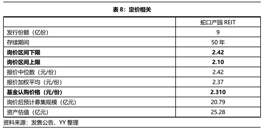 最后蛇口產園REIT的發行價為2.310元/份,均低于報價的中位數和加權平均數,詢價后的預計募集規模均小于原資產估值。