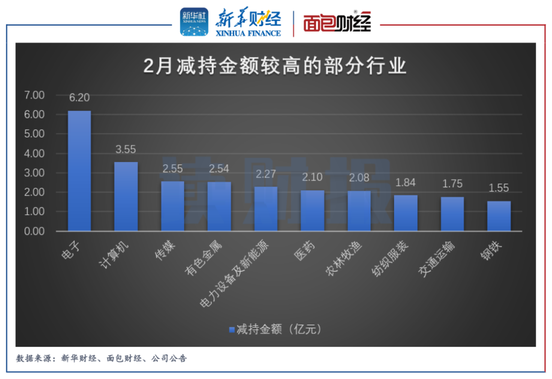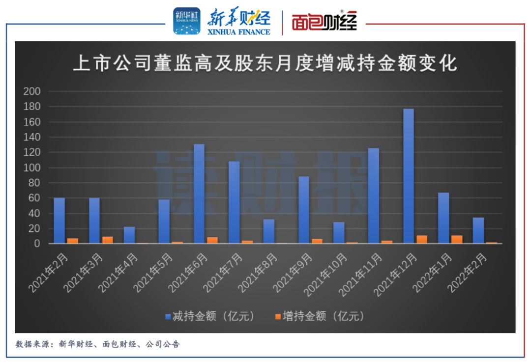 新華財經和面包財經根據上市公司的信披數據統計,2022年2月,滬深兩市上市公司董監高及其關聯人減持金額合計約34.13億元,涉及128家公司;增持金額合計約1.82億元,涉及38家公司。增、減持金額相抵之后,凈減持金額32.31億元。